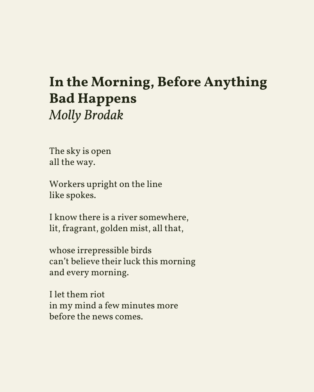 “I know there is a river somewhere, / lit, fragrant, golden mist, all that” — Molly Brodak