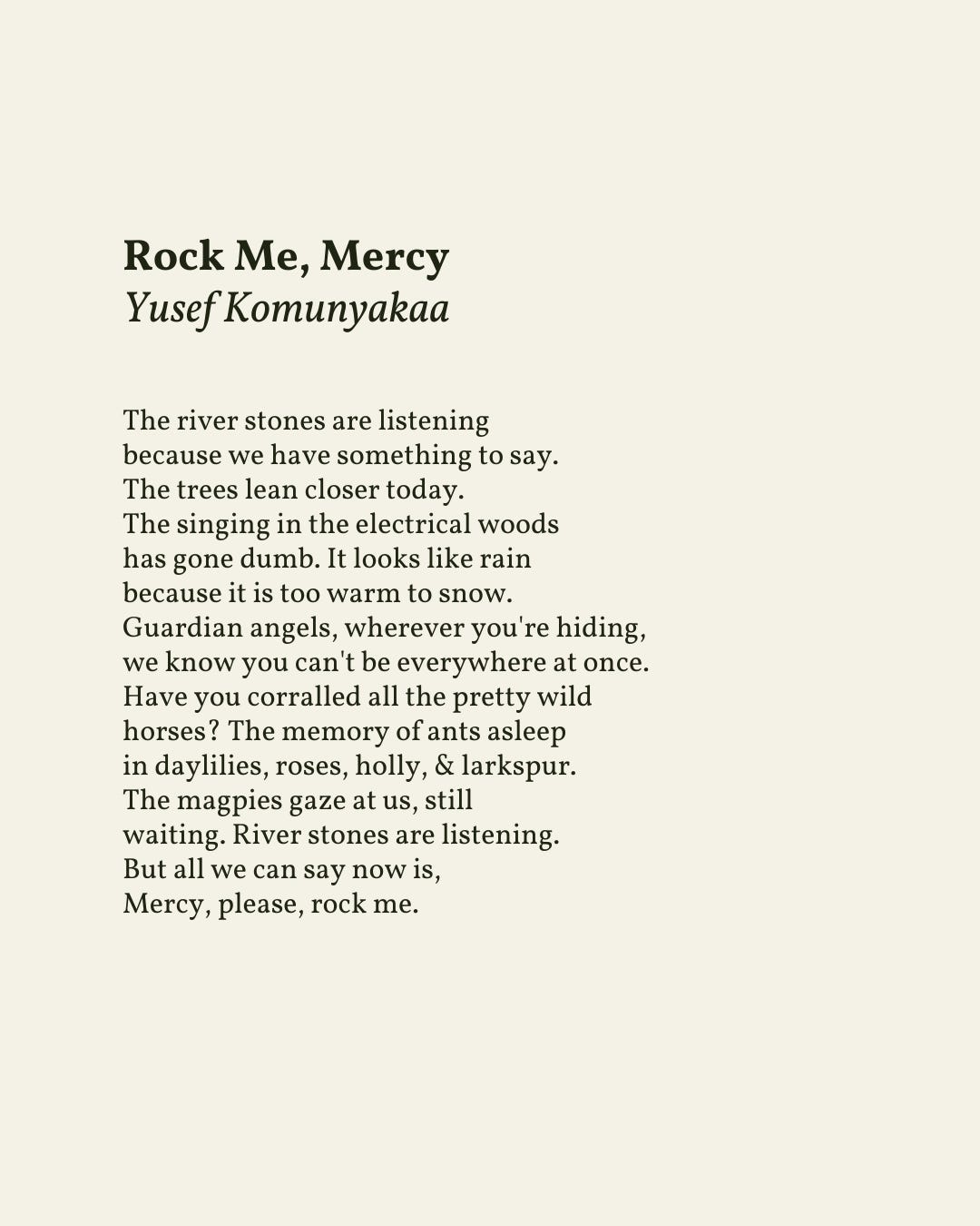 “Guardian angels, wherever you're hiding, / we know you can't be everywhere at once.” — Yusef Komunyakaa