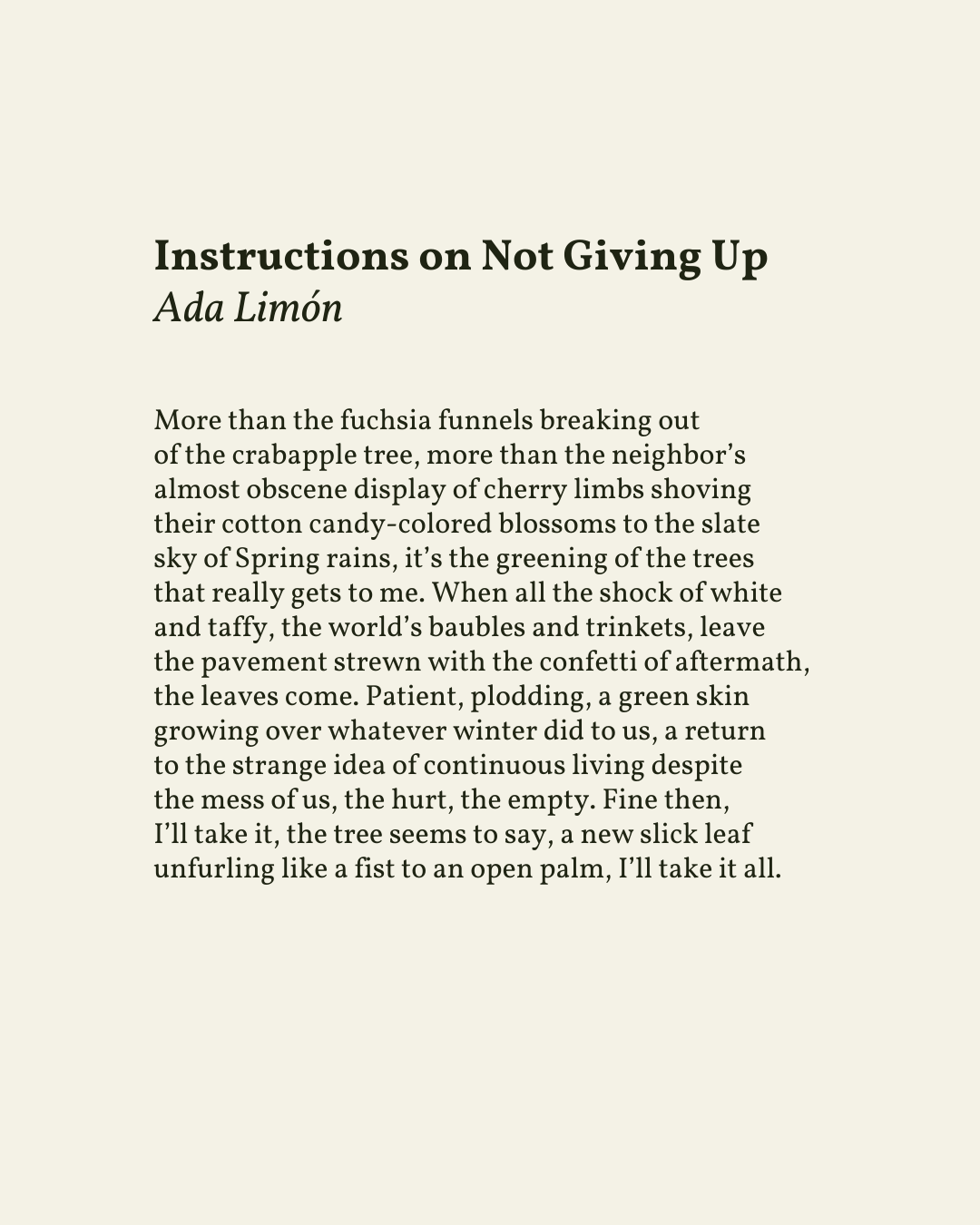“a return / to the strange idea of continuous living despite / the mess of us, the hurt, the empty” — Ada Limón