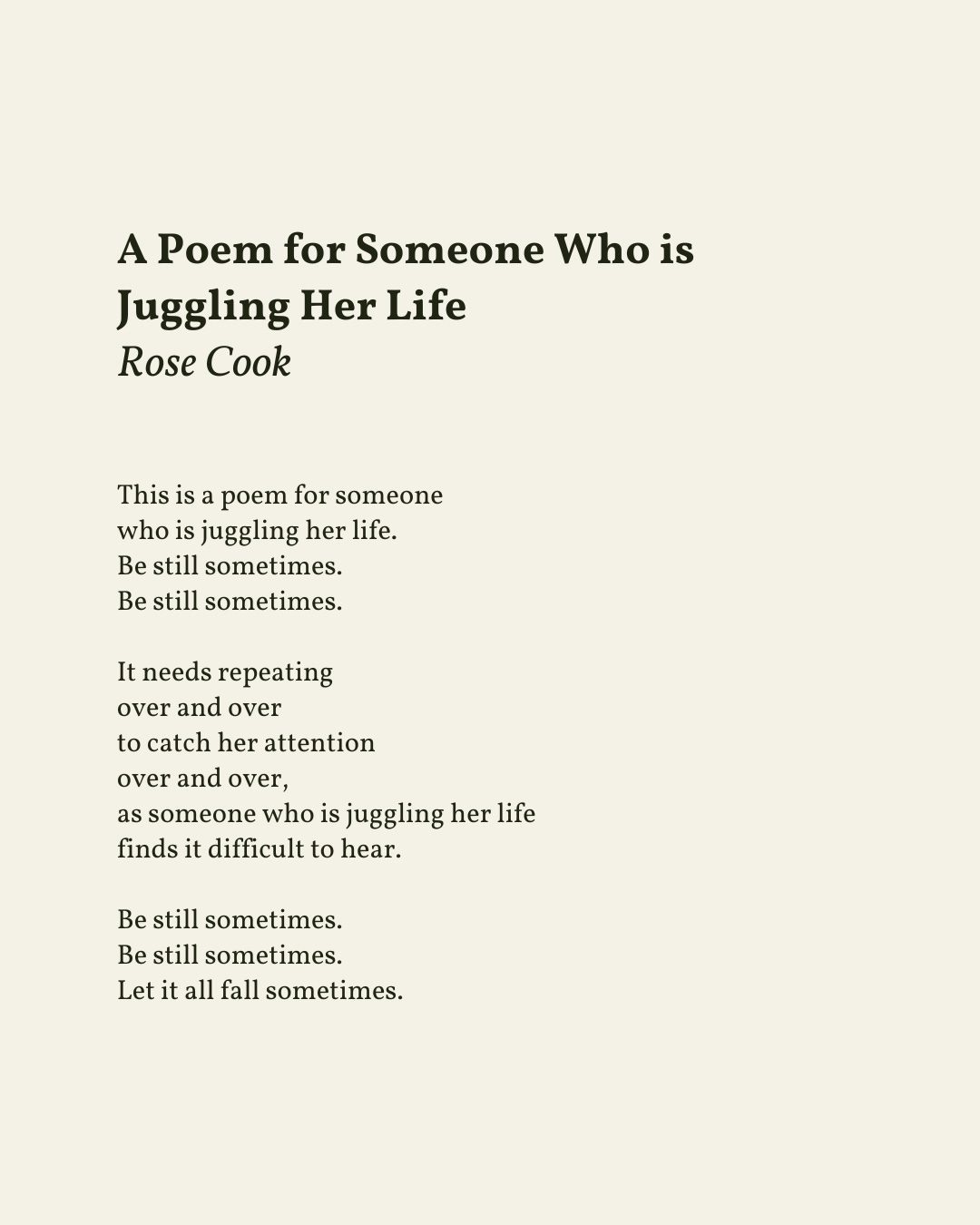 “It needs repeating / over and over / to catch her attention / over and over,” — Rose Cook